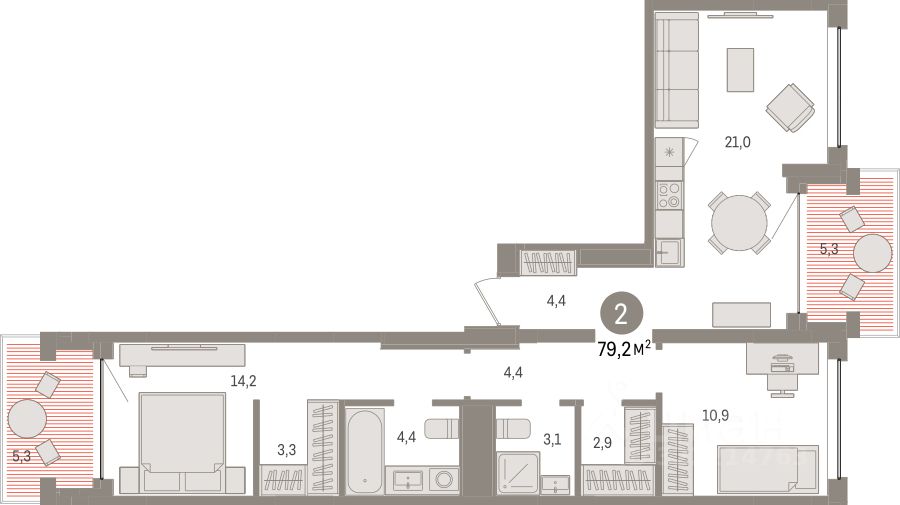 2-комн. квартира от застройщика с предчистовой отделкой в ЖК "Дом у озера" на 7 этаже. Общая площадь: 79.2 кв.м., жилая: 25.1 кв.м., площадь просторной кухни-гостиной: 21 кв.м. Квартира - распашонка, без проходных комнат, окна выходят на paзные стороны дома. В квартире два балкона, два совмещенных санузла. Высота потолков 2.7 м.