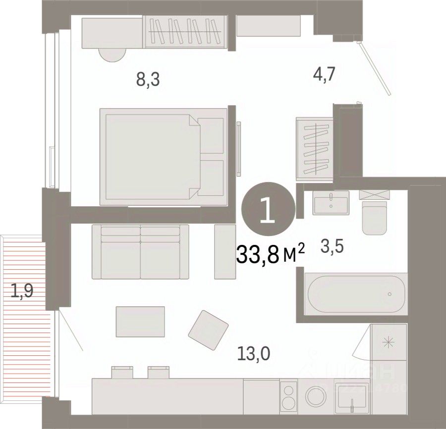 1-комн. квартира от застройщика с предчистовой отделкой в ЖК "Зарека" на 16 этаже. Общая площадь: 33.78 кв.м., жилая: 8.3 кв.м., площадь просторной кухни-гостиной: 13 кв.м. Все окна выходят на одну сторону. В квартире один балкон, один совмещенный санузел. Высота потолков 2.7 м.