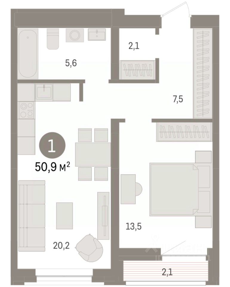 Квартира с кухней-гостиной и одной спальней в жилом районе "Речной порт". Особенности планировки: гардеробная, лоджия, предчистовая отделка.