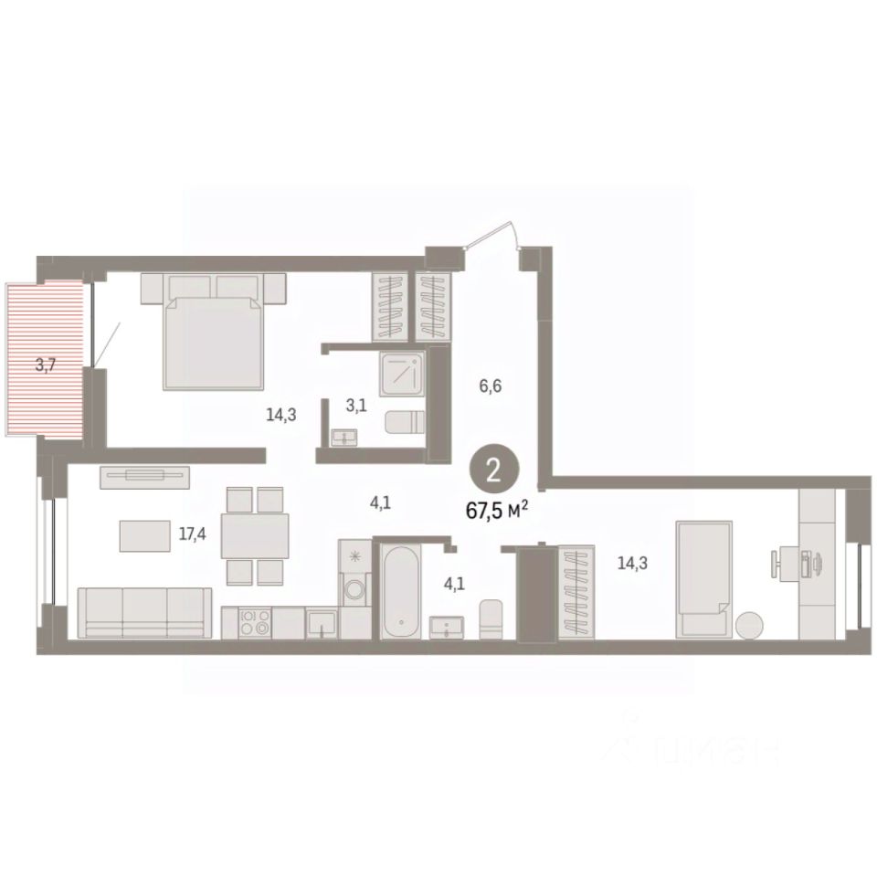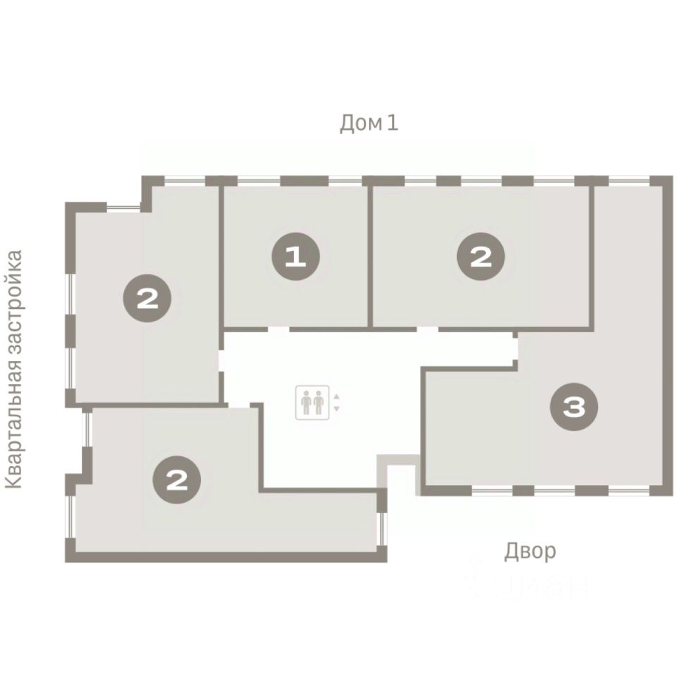 Квартира с кухней-гостиной и двумя спальнями в жилом районе "Речной порт". Особенности планировки: вид во двор, разнесённые спальни, предчистовая отделка, мастер-спальня, балкон.