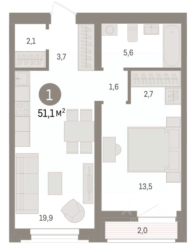 Квартира с кухней-гостиной и одной спальней в жилом районе "Речной порт". Особенности планировки: гардеробная, лоджия, предчистовая отделка.