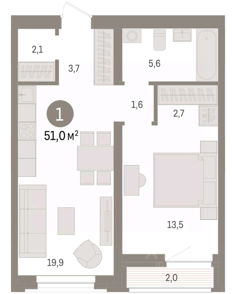 Квартира с кухней-гостиной и одной спальней в жилом районе "Речной порт". Особенности планировки: гардеробная, лоджия, предчистовая отделка.