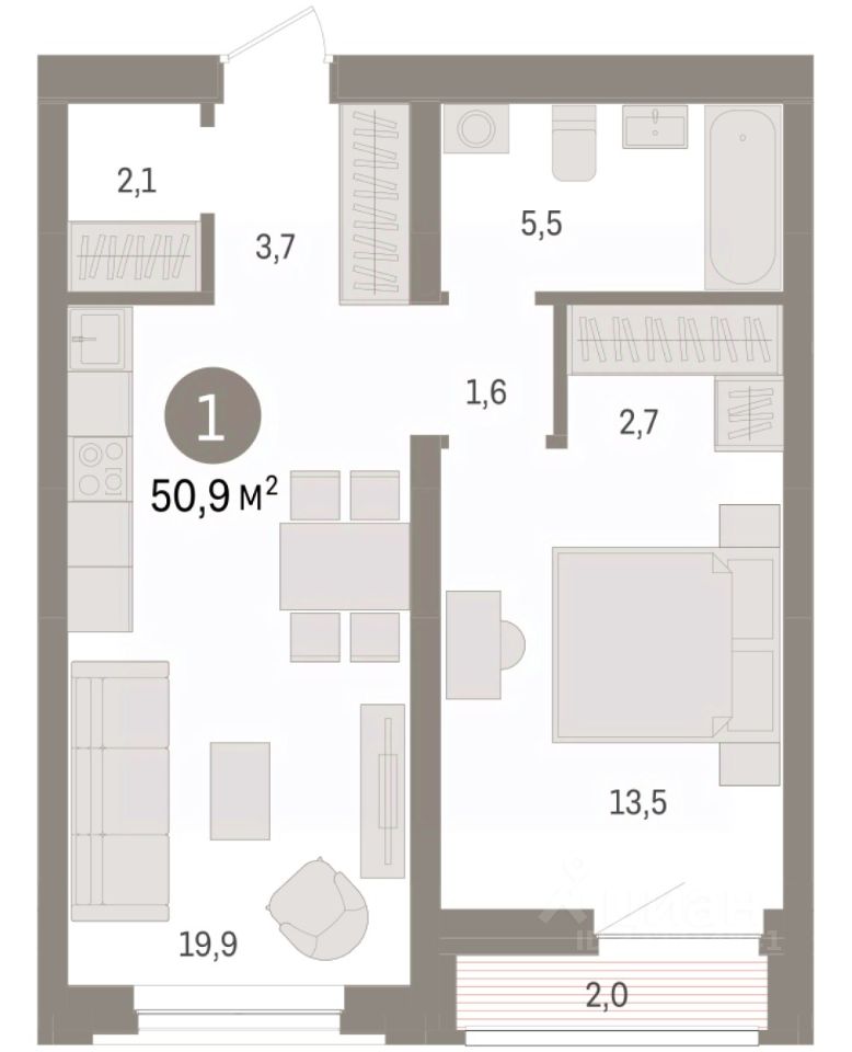 Квартира с кухней-гостиной и одной спальней в жилом районе "Речной порт". Особенности планировки: гардеробная, лоджия, предчистовая отделка.