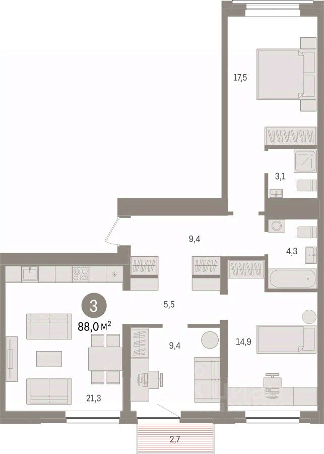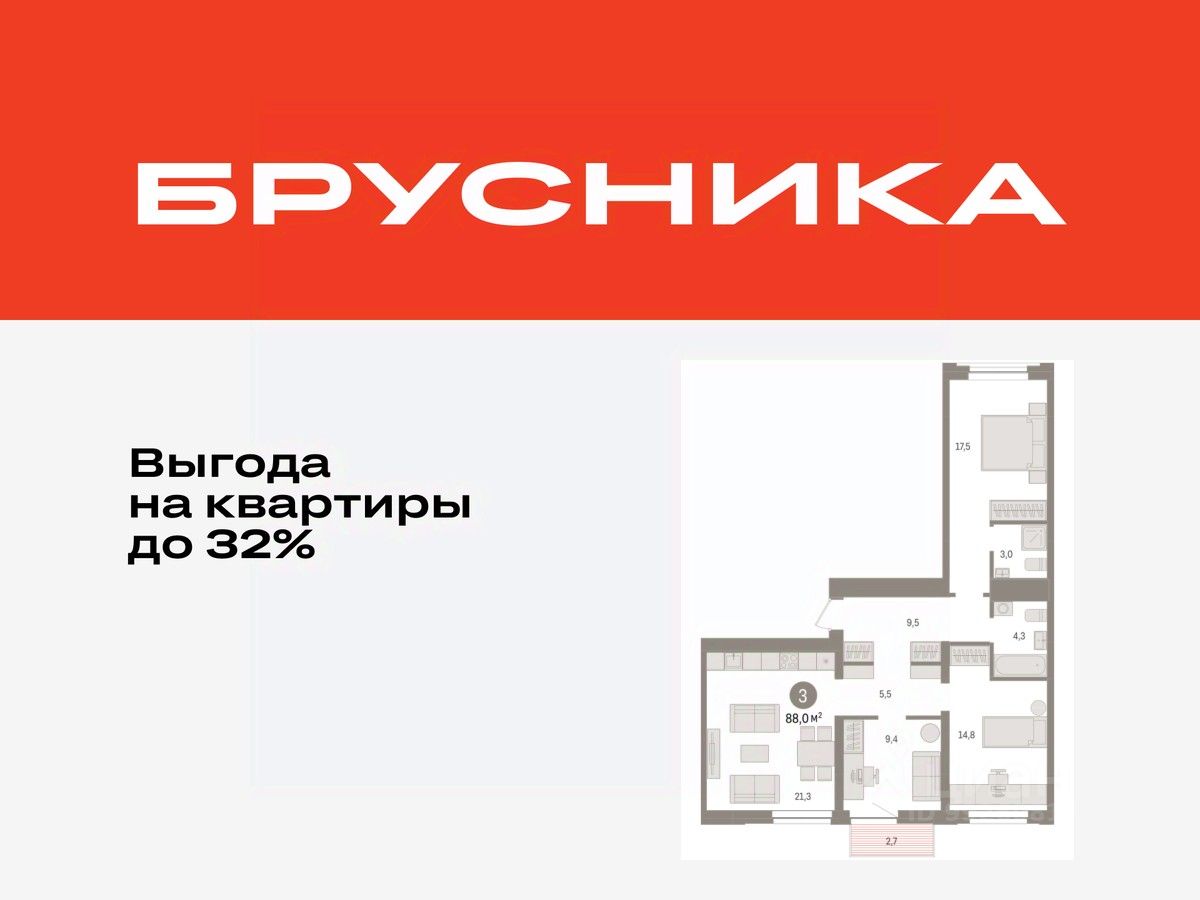 Квартира с кухней-гостиной и тремя спальнями в жилом районе "Речной порт". Особенности планировки: вид во двор, разнесённые спальни, предчистовая отделка, мастер-спальня, балкон.