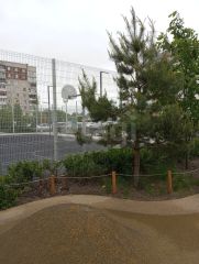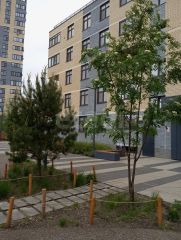 Закрытый двор зонирован на парковку для жильцов и придомовую территорию, на которую не заезжают автомобили. Там расположена: детская площадка с множеством сооружений для разных возрастов, баскетбольная площадка, зона с тренажерами, деревянные лежаки для отдыха. Привлекательно выглядит озеленение территории и двухуровневое освещение. Имеется система видеонаблюдения.