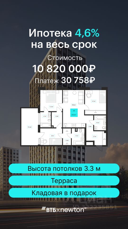 Продаётся 3-комнатная квартира в строящемся доме (Дом 6к2), срок сдачи: IV-кв. 2025, общей площадью 97.6 кв.м., на 2 этаже. Новый жилой комплекс "Futuro" от застройщика "newton" расположен в г. Тюмень на Ставропольской улице.