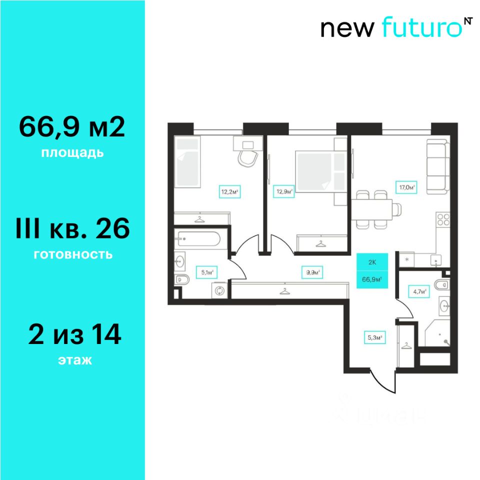 Продаётся 2-комнатная квартира в строящемся доме (Дом 6к2), срок сдачи: III-кв. 2026, общей площадью 66.9 кв.м., на 2 этаже. Новый жилой комплекс "Futuro" от застройщика "newton" расположен в г. Тюмень на Ставропольской улице.