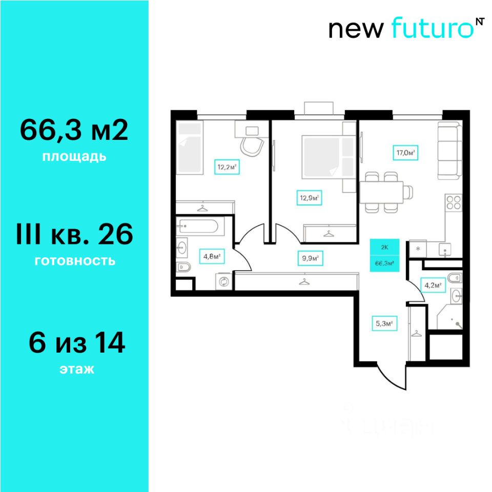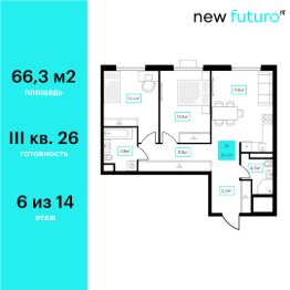 Продаётся 2-комнатная квартира в строящемся доме (Дом 6к2), срок сдачи: III-кв. 2026, общей площадью 66.3 кв.м., на 6 этаже. Новый жилой комплекс "Futuro" от застройщика "newton" расположен в г. Тюмень на Ставропольской улице.