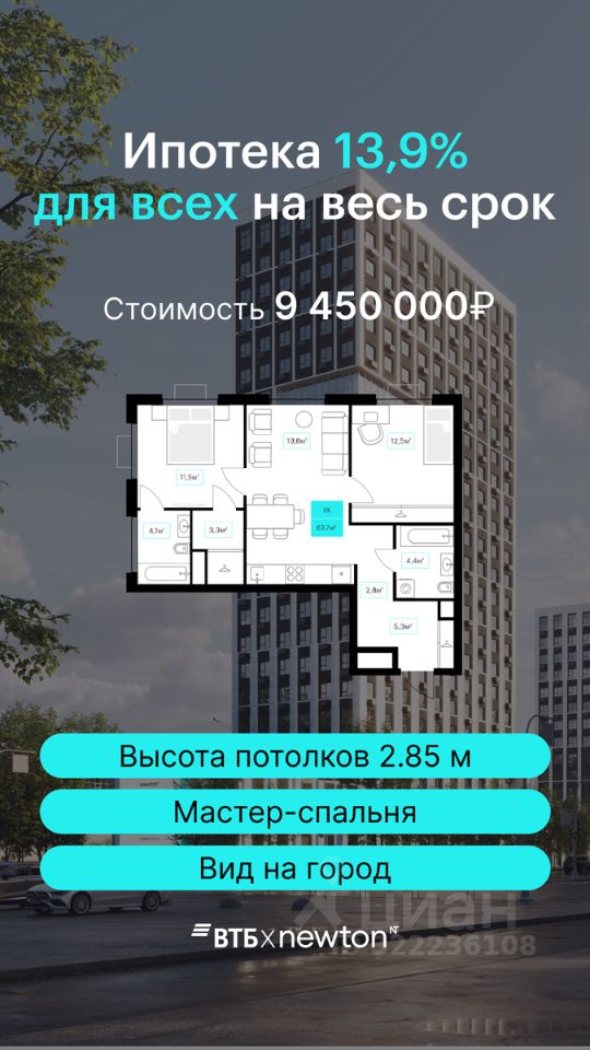 Продаётся 2-комнатная квартира в строящемся доме (Дом 6к2), срок сдачи: IV-кв. 2025, общей площадью 63.7 кв.м., на 11 этаже. Новый жилой комплекс "Futuro" от застройщика "newton" расположен в г. Тюмень на Ставропольской улице.