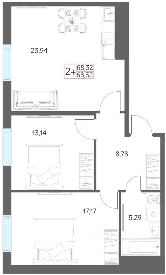 Продаётся 3-комнатная квартира в строящемся доме (ГП-1 (Дом 29)), срок сдачи: I-кв. 2027, общей площадью 68.32 кв.м., на 1 этаже. Рассвет в Тобольске - это жилой комплекс из 4 домов, расположенный в границах улиц Нефтехимиков и Александра Абдулова, созданный для семейного проживания.