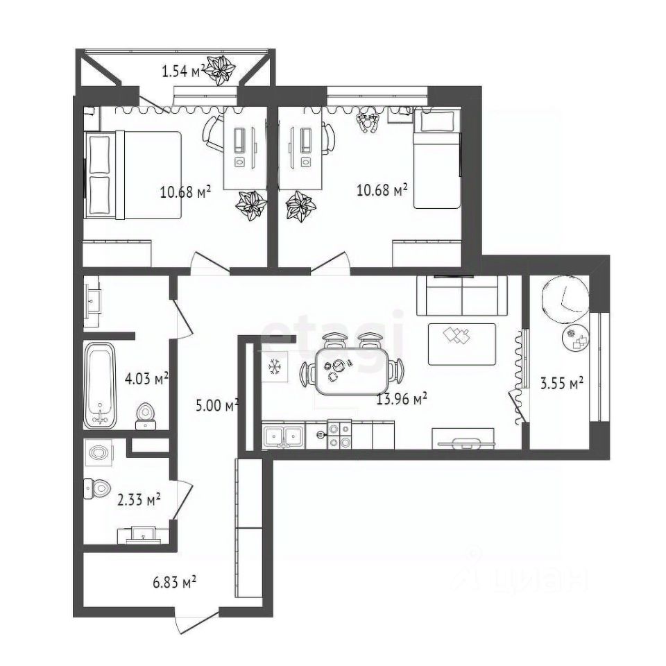 Двухкомнатная квартира в улучшенной черновой отделке 58,6 кв.м. Кухня 13,96 кв.м., две спальни по 10,68 кв.м., теплая лоджия застеклена 3,55 кв.м., лоджия 1,54 кв.м. Санузел раздельный. Стены выровнены под маяк, стяжка пола с шумоизолирующим эффектом, гидроизоляция пола в мокрых зонах, горизонтальная разводка водоснабжения и отопления, монтаж систем электроснабжения, телеметрия (автоматическое отправление показаний счетчиков), счетчики воды, ТВ и интернет кабель до квартиры, окна с двухкамерным стеклопакетом без устройства подоконников и откосов, входная металлическая дверь.