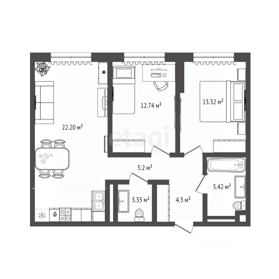 Уважаемые покупатели! Продается двухкомнатная квартира (2+) Общая площадь квартиры составляет 68м2. Площадь комнат: Кухня-гостиная 23,53 м2. Просторная спальня 12 м2. Детская 13. 2 сан узла.
