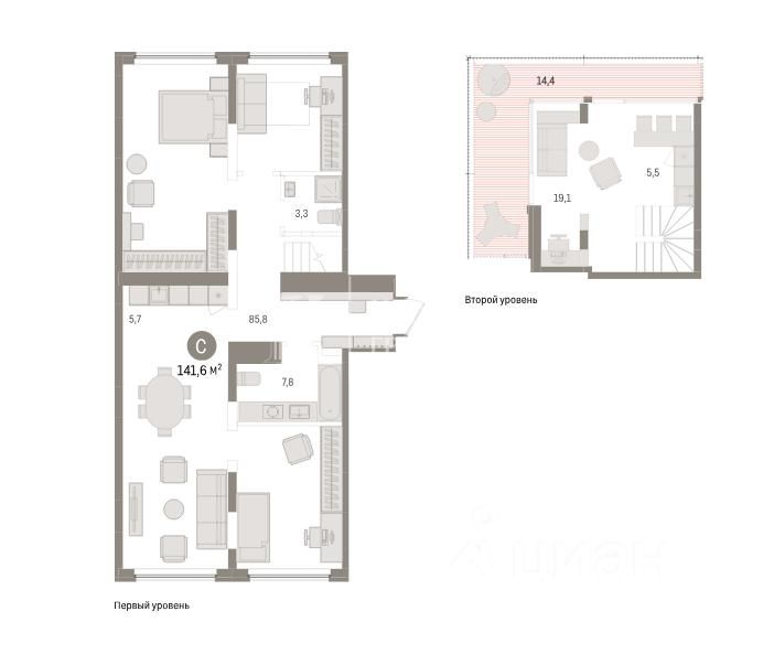 Двухуровневая квартира общей площадью 141,6 м напоминает загородный дом. Расположенная на пятом этаже монолитного здания, она предлагает не только комфорт и простор, но и потрясающие виды.Квартира свободной планировки, что позволяет реализовать самые смелые дизайнерские решения и зонирование пространства. Например, можно разделить пространство на приватное и общественное: на одном этаже расположить спальни, а на другом - хозяйственные помещения и кухню-гостиную.