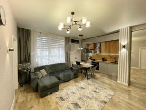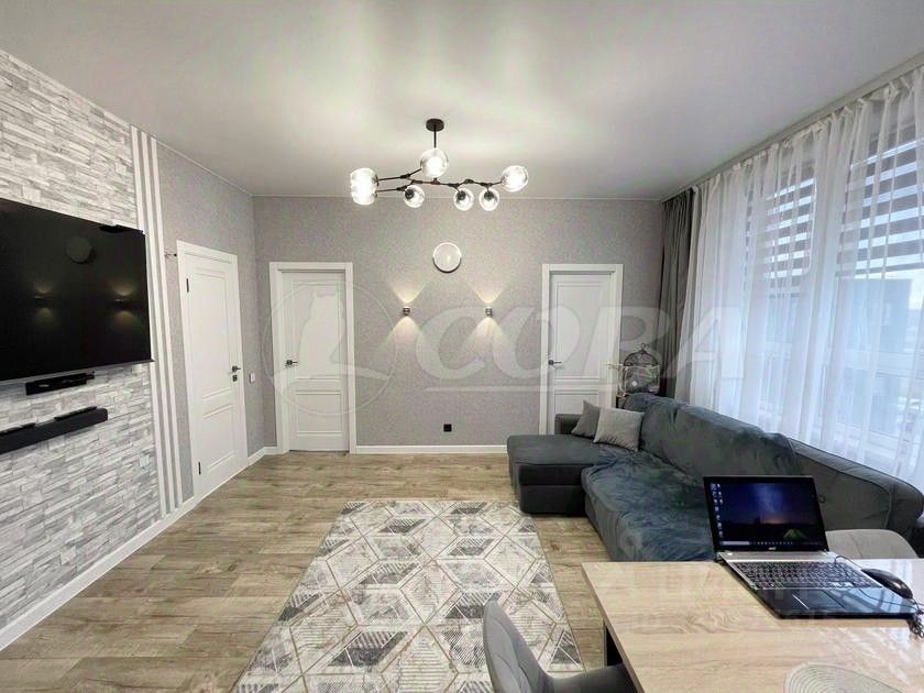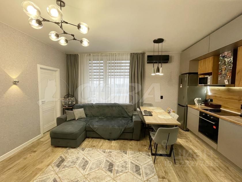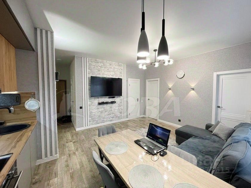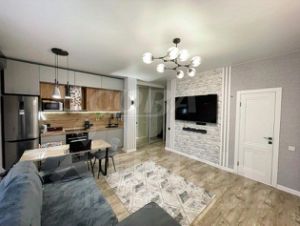 Каждое помещение оформлено в едином стильном ключе и содержит всё необходимое для комфортной жизни. На полу уложен качественный кварцвинил с натуральным древесным рисунком, а стены оформлены современными обоями под бетон. Натяжные потолки добавляют свежести и завершенности.