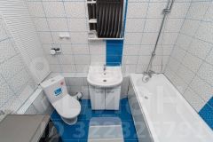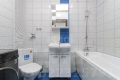 Современный ремонт в серо-белых тонах, ванная комната выполнена в бело-голубой гамме