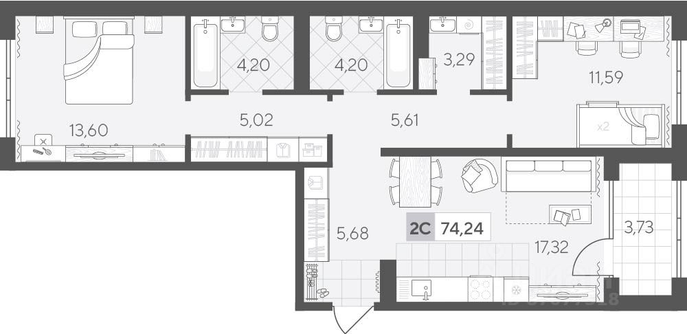 Двухкомнатная квартира 74.24 кв.м на 2 этаже — идеальный вариант для молодой семьи или пары. Просторная кухня-гостиная станет местом семейных встреч, а две спальни обеспечат удобство и приватность для каждого.