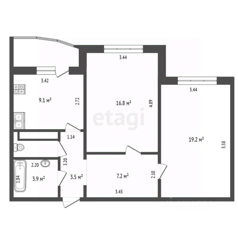 Кухня, две изолированные комнаты, раздельный с/у, просторный коридор с большим шкаф-купе, лоджия.