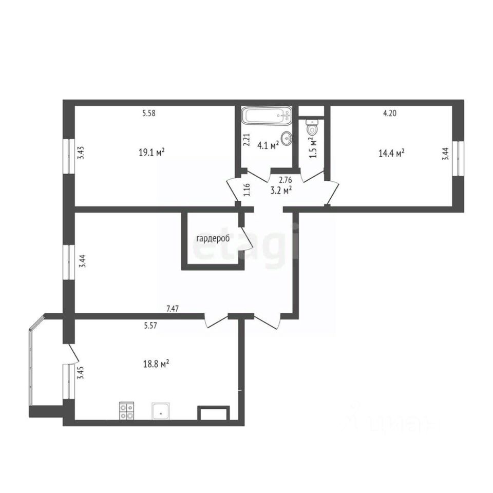 Функциональная планировка состоящая из просторной кухни-гостиной, трех спален, раздельного санузла и прихожей.