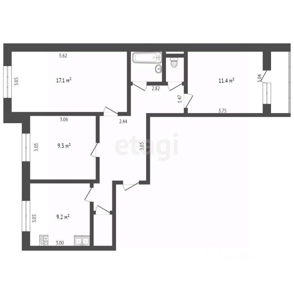 Санузел раздельный, с практичной отделкой кафельной плиткой. Планировка предлагает просторные изолированные комнаты, что создает условия для уединения каждого члена семьи.