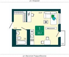 Однокомнатная квартира-студия в ЖК "Уездные кварталы" на 5 этаже. Квартира без отделки, после выдачи ключей можно делать ремонт. Общая площадь: 33.1 кв.м., площадь гостиной 22.9 кв.м., из которых 5 кв.м. выделено под кухонную зону. Все окна выходят на одну сторону. В квартире один балкон, один совмещенный санузел. Высота потолков 2.72 м.