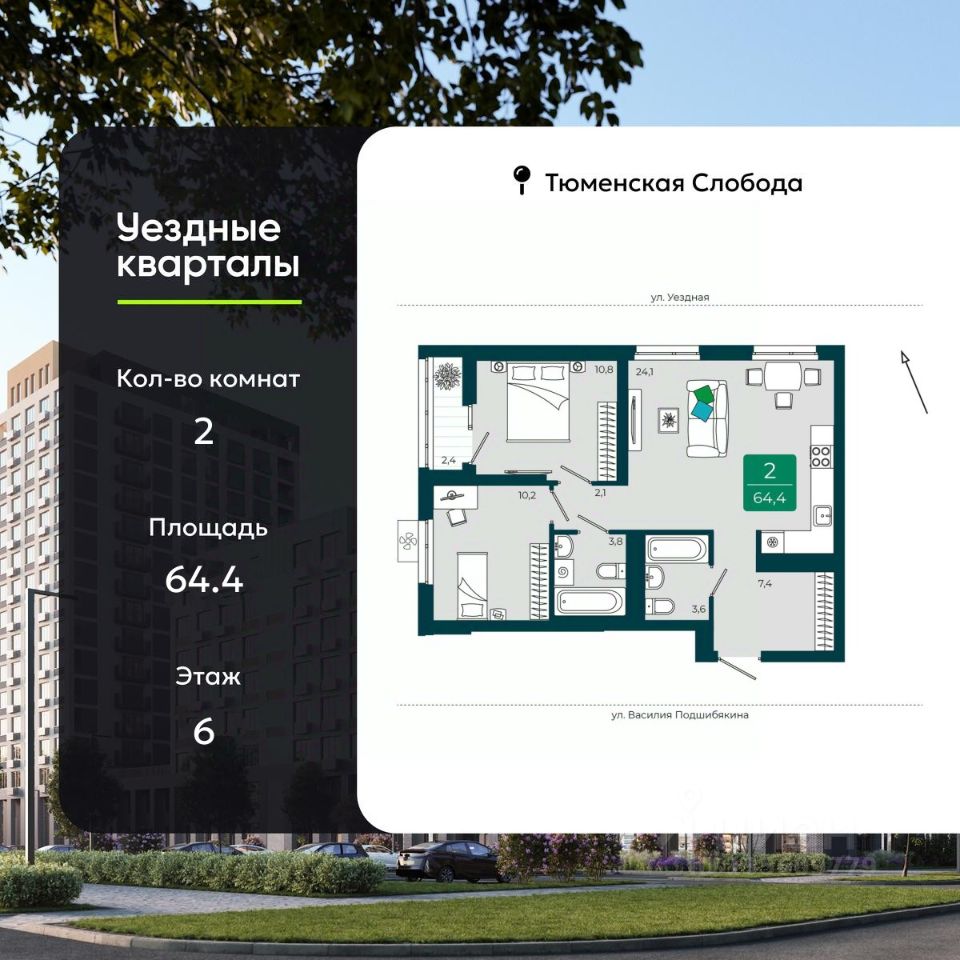 Двухкомнатная квартира в ЖК "Уездные кварталы" на 6 этаже. Квартира без отделки, после оформления собственности можно делать ремонт. Общая площадь: 64.4 кв.м., жилая: 21 кв.м., площадь просторной кухни-столовой: 24.1 кв.м. Угловая квартира, очень светлая, естественная вентиляция при открытии окон. В квартире одна лоджия, два совмещенных санузла. Высота потолков 2.72 м.