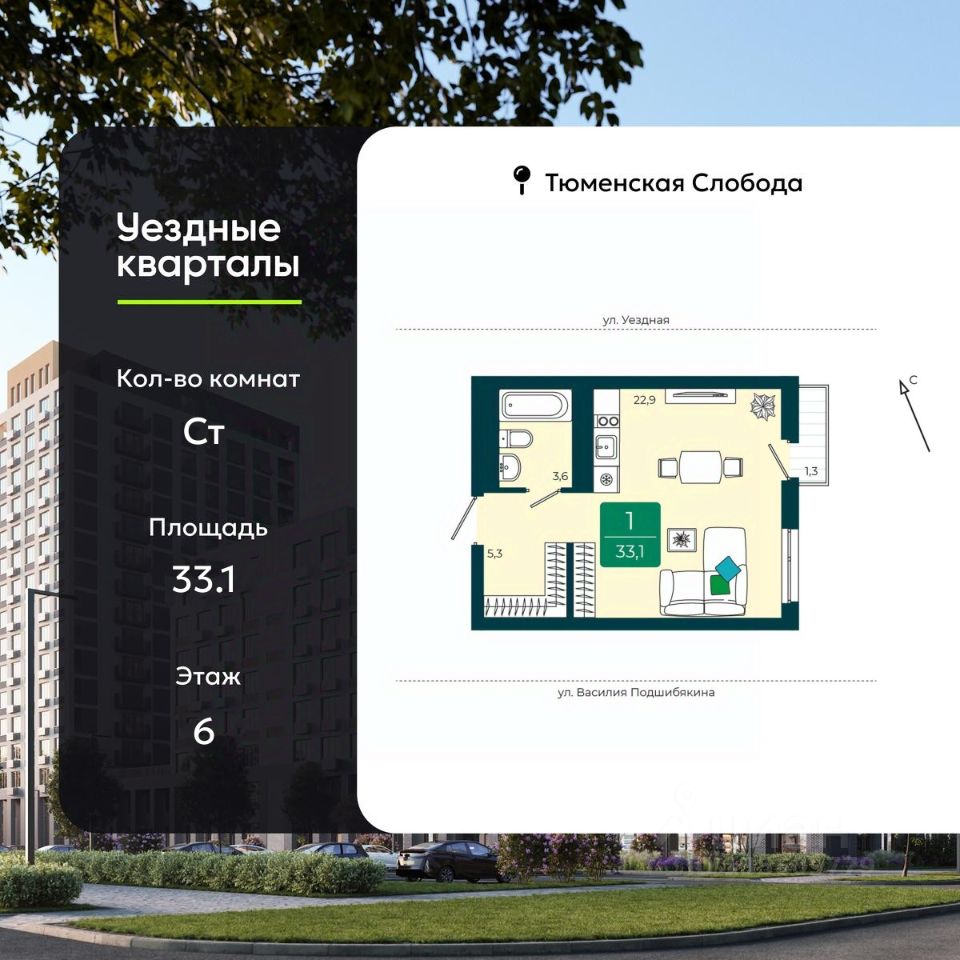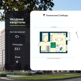 Однокомнатная квартира-студия от застройщика в ЖК "Уездные кварталы" на 6 этаже. Квартира без отделки, полностью готова к чистовой отделке и дальнейшему ремонту. Общая площадь: 33.1 кв.м., площадь гостиной 22.9 кв.м., из которых 5 кв.м. выделено под кухонную зону. Все окна выходят на одну сторону. В квартире один балкон, один совмещенный санузел. Высота потолков 2.72 м.