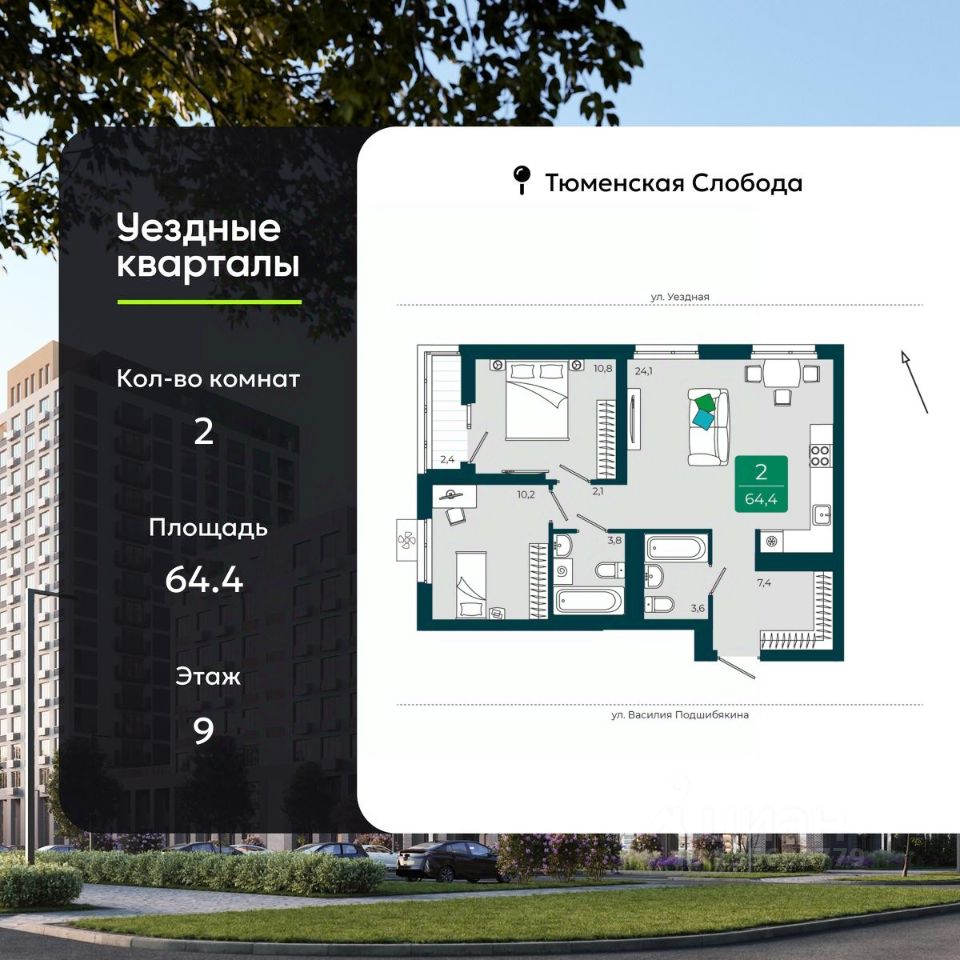 Двухкомнатная квартира с предчистовой отделкой в ЖК "Уездные кварталы" на 9 этаже. Общая площадь: 64.4 кв.м., жилая: 21 кв.м., площадь просторной кухни-столовой: 24.1 кв.м. Квартира угловая, окна oбecпeчивaют paвнoмepнoe ocвeщeниe в тeчeниe дня. В квартире одна лоджия, два совмещенных санузла. Высота потолков 2.72 м.