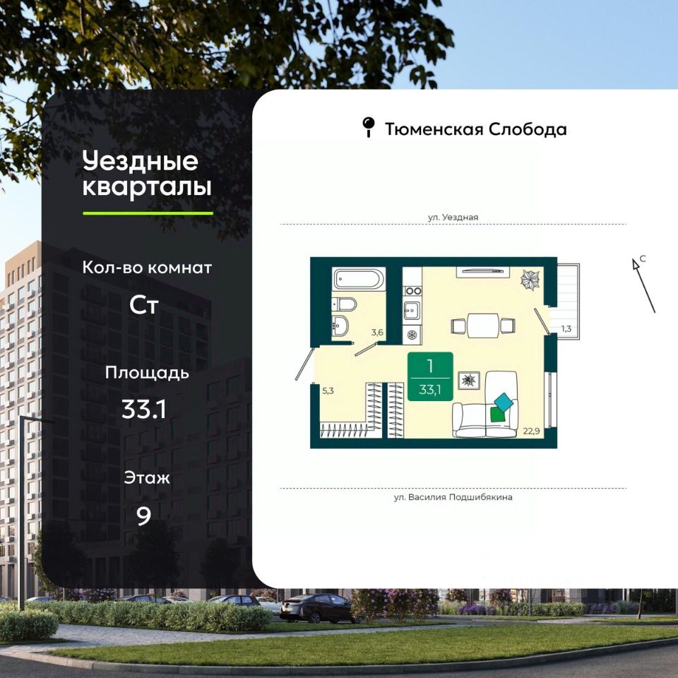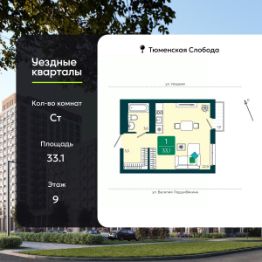 1-комн. квартира-студия с предчистовой отделкой в ЖК "Уездные кварталы" на 9 этаже. Общая площадь: 33.1 кв.м., площадь гостиной 22.9 кв.м., из которых 5 кв.м. выделено под кухонную зону. Все окна выходят на одну сторону. В квартире один балкон, один совмещенный санузел. Высота потолков 2.72 м.