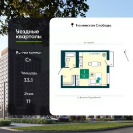 Продается 1-комн. квартира-студия от застройщика в ЖК "Уездные кварталы" на 11 этаже. Квартира без отделки, после оформления собственности можно делать ремонт. Общая площадь: 33.1 кв.м., площадь гостиной 22.9 кв.м., из которых 5 кв.м. выделено под кухонную зону. Все окна выходят на одну сторону. В квартире один балкон, один совмещенный санузел. Высота потолков 2.72 м.