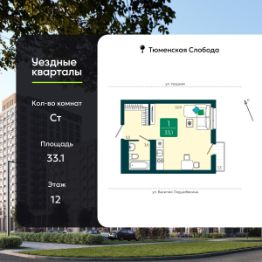 Однокомнатная квартира-студия от застройщика в ЖК "Уездные кварталы" на 12 этаже. Квартира без отделки, новый собственник может сделать ремонт по индивидуальному проекту. Общая площадь: 33.1 кв.м., площадь гостиной 22.9 кв.м., из которых 5 кв.м. выделено под кухонную зону. Все окна выходят на одну сторону. В квартире один балкон, один совмещенный санузел. Высота потолков 2.72 м.