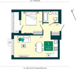 Однокомнатная квартира от застройщика в ЖК "Уездные кварталы" на 13 этаже. Квартира без отделки, после получения ключей можно делать ремонт. Общая площадь: 43.2 кв.м., жилая: 12.13 кв.м., площадь просторной кухни-столовой: 20.19 кв.м. Все окна выходят на одну сторону. В квартире один балкон, один совмещенный санузел. Высота потолков 2.72 м.