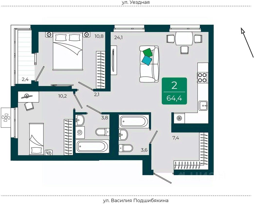 2-комн. квартира с предчистовой отделкой в ЖК "Уездные кварталы" на 3 этаже. Общая площадь: 64.4 кв.м., жилая: 21 кв.м., площадь просторной кухни-столовой: 24.1 кв.м. Угловая квартира, очень светлая, естественная вентиляция при открытии окон. В квартире одна лоджия, два совмещенных санузла. Высота потолков 2.72 м.