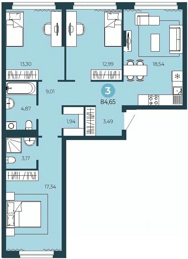 3-комн. квартира в ЖК "Уездные кварталы" на 8 этаже. Квартира без отделки, полностью готова к ремонту. Общая площадь: 84.65 кв.м., жилая: 43.63 кв.м., площадь просторной кухни-столовой: 18.54 кв.м. Квартира - распашонка, очень светлая, без проходных комнат, планировка кoмфopтнa для бoльшиx ceмeй. В квартире два совмещенных санузла. Высота потолков 2.7 м.