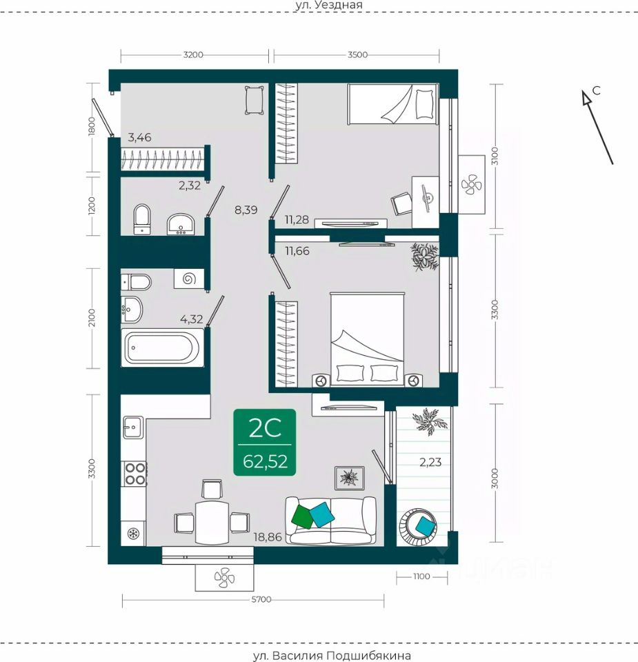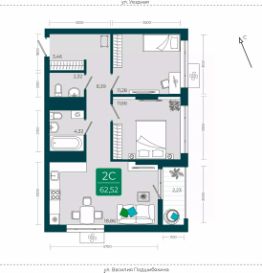 Двухкомнатная квартира в ЖК "Уездные кварталы" на 12 этаже. Квартира без отделки, после получения ключей можно делать ремонт. Общая площадь: 62.52 кв.м., жилая: 22.94 кв.м., площадь просторной кухни-столовой: 18.86 кв.м. Угловая квартира, очень светлая, естественная вентиляция при открытии окон. В квартире одна лоджия, один совмещенный и один раздельный санузел. Высота потолков 2.6 м.