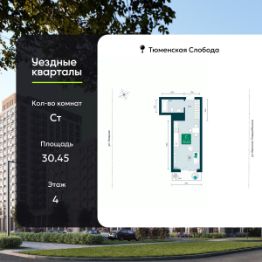 1-комн. квартира-студия в ЖК "Уездные кварталы" на 4 этаже. Квартира без отделки, после оформления собственности можно делать ремонт. Общая площадь: 30.45 кв.м., площадь гостиной 18.47 кв.м., из которых 5 кв.м. выделено под кухонную зону. Все окна выходят на одну сторону. В квартире один балкон, один совмещенный санузел. Высота потолков 2.7 м.