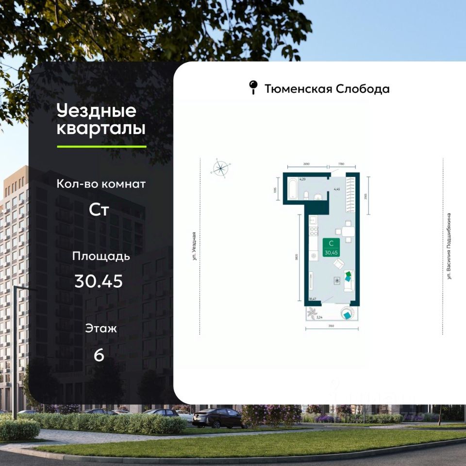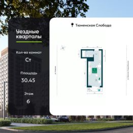 1-комн. квартира-студия в ЖК "Уездные кварталы" на 6 этаже. Квартира без отделки, после оформления собственности можно делать ремонт. Общая площадь: 30.45 кв.м., площадь гостиной 18.47 кв.м., из которых 5 кв.м. выделено под кухонную зону. Все окна выходят на одну сторону. В квартире один балкон, один совмещенный санузел. Высота потолков 2.7 м.