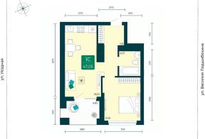 1-комн. квартира от застройщика с предчистовой отделкой в ЖК "Уездные кварталы" на 11 этаже. Общая площадь: 47.05 кв.м., жилая: 12.09 кв.м., площадь просторной кухни-столовой: 18.63 кв.м. Все окна выходят на одну сторону. В квартире одна лоджия, один совмещенный санузел. Высота потолков 2.7 м.
