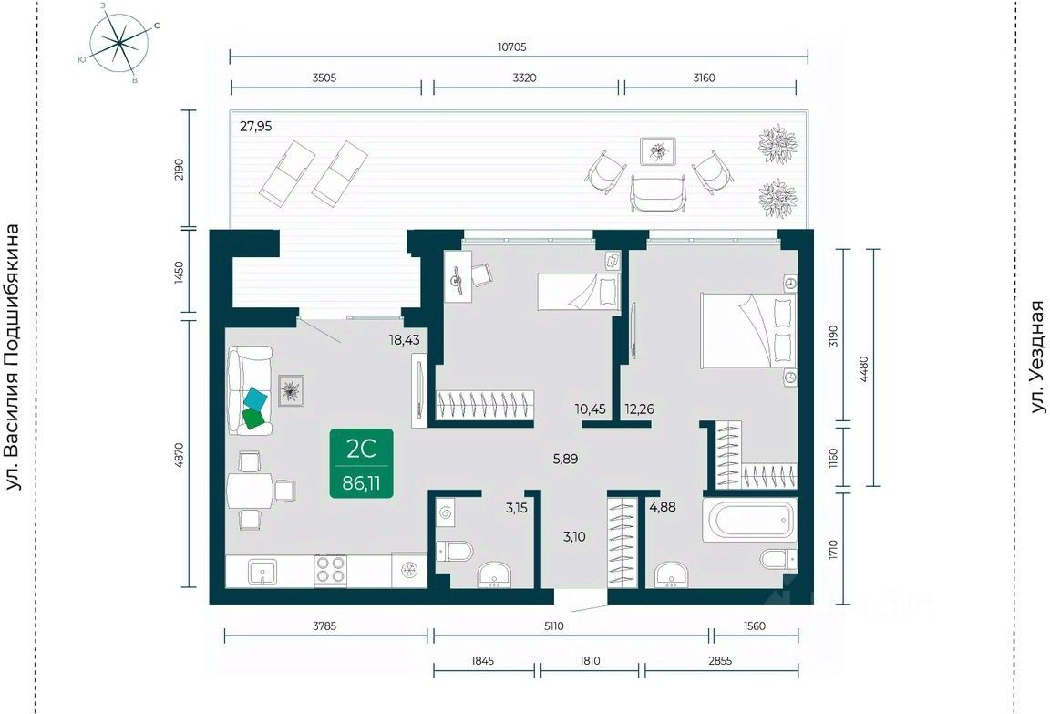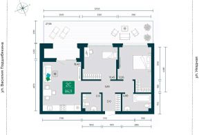 2-комн. квартира с предчистовой отделкой в ЖК "Уездные кварталы" на 1 этаже. Общая площадь: 86.11 кв.м., жилая: 22.71 кв.м., площадь просторной кухни-столовой: 18.43 кв.м. Комнаты изолированные, все окна выходят на одну сторону. В квартире один балкон, один совмещенный и один раздельный санузел. Наличие в квартире террасы открывает возможность для создания зон отдыха в кругу семьи и друзей. Высота потолков 2.7 м.