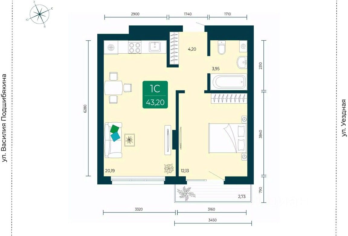 1-комн. квартира с предчистовой отделкой в ЖК "Уездные кварталы" на 6 этаже. Общая площадь: 43.2 кв.м., жилая: 12.13 кв.м., площадь просторной кухни-столовой: 20.19 кв.м. Все окна выходят на одну сторону. В квартире один балкон, один совмещенный санузел. Высота потолков 2.7 м.