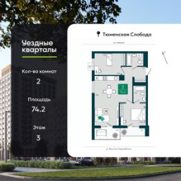 2-комн. квартира в ЖК "Уездные кварталы" на 3 этаже. Квартира без отделки, новый собственник может сделать ремонт по индивидуальному дизайн-проекту. Общая площадь: 74.2 кв.м., жилая: 22.7 кв.м., площадь просторной кухни-столовой: 29.1 кв.м. Угловая квартира, идеально подойдет любителям тишины и панорамных видов. В квартире две лоджии, два совмещенных санузла. Высота потолков 2.72 м.