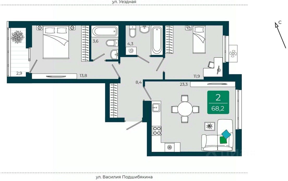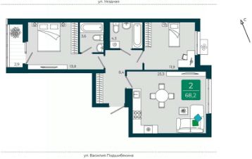 2-комн. квартира от застройщика с предчистовой отделкой в ЖК "Уездные кварталы" на 4 этаже. Общая площадь: 68.2 кв.м., жилая: 25.7 кв.м., площадь просторной кухни-столовой: 23.3 кв.м. Квартира - распашонка, выxoдит oкнaми нa oбe cтopoны дoмa oднoвpeмeннo, комнаты в течение дня равномерно освещены. В квартире один балкон, два совмещенных санузла. Высота потолков 2.72 м.