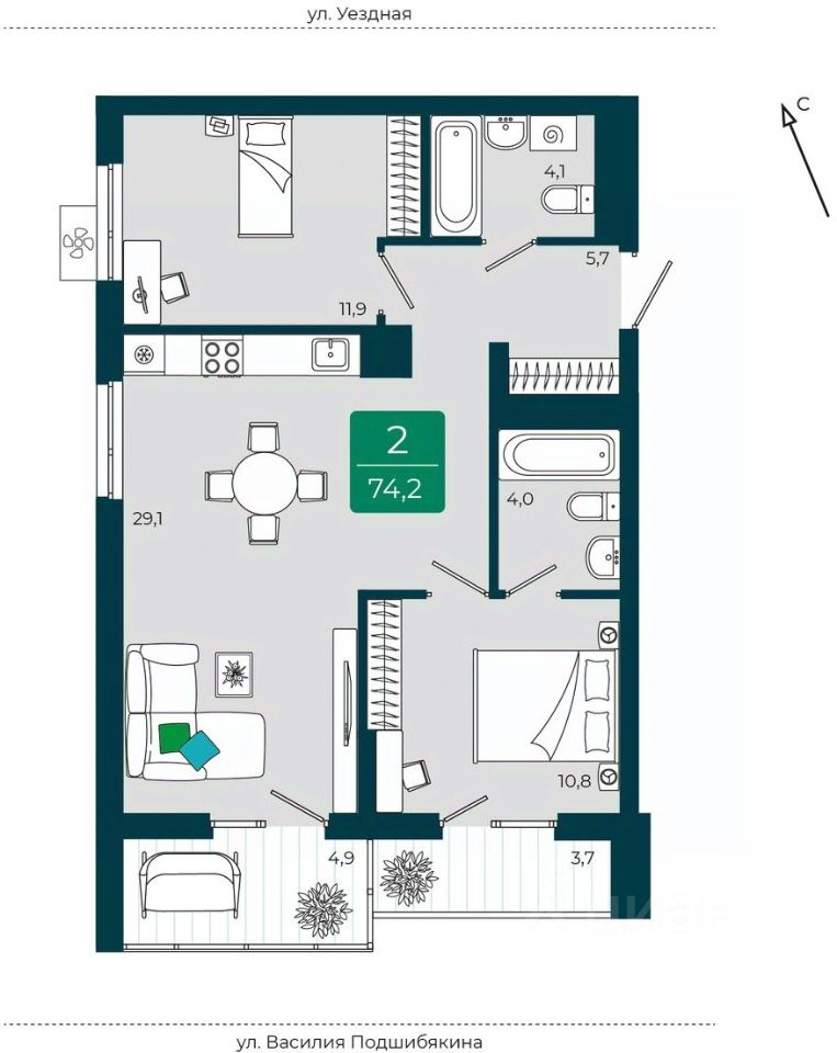Двухкомнатная квартира с предчистовой отделкой в ЖК "Уездные кварталы" на 9 этаже. Общая площадь: 74.2 кв.м., жилая: 22.7 кв.м., площадь просторной кухни-столовой: 29.1 кв.м. Угловая квартира, очень светлая, естественная вентиляция при открытии окон. В квартире две лоджии, два совмещенных санузла. Высота потолков 2.72 м.