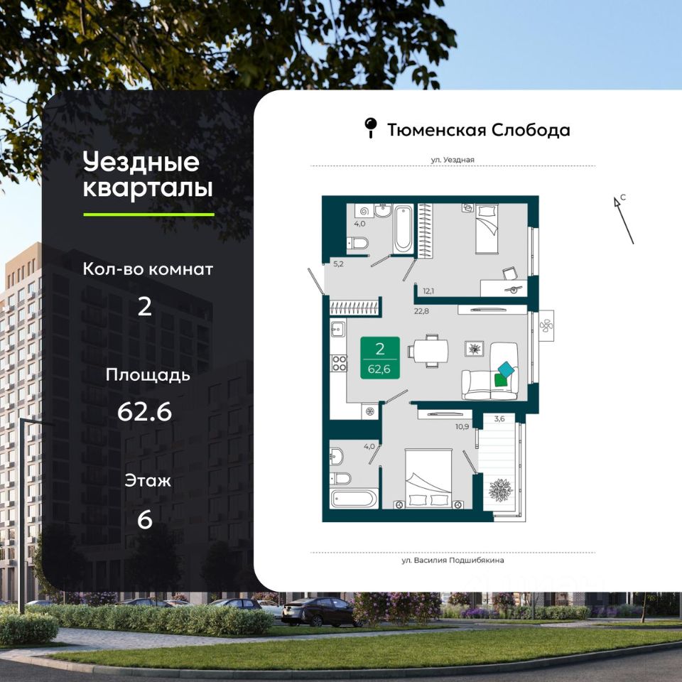 Продается 2-комн. квартира с предчистовой отделкой в ЖК "Уездные кварталы" на 6 этаже. Общая площадь: 62.6 кв.м., жилая: 23 кв.м., площадь просторной кухни-столовой: 22.8 кв.м. Комнаты изолированные, все окна выходят на одну сторону. В квартире одна лоджия, два совмещенных санузла. Высота потолков 2.72 м.