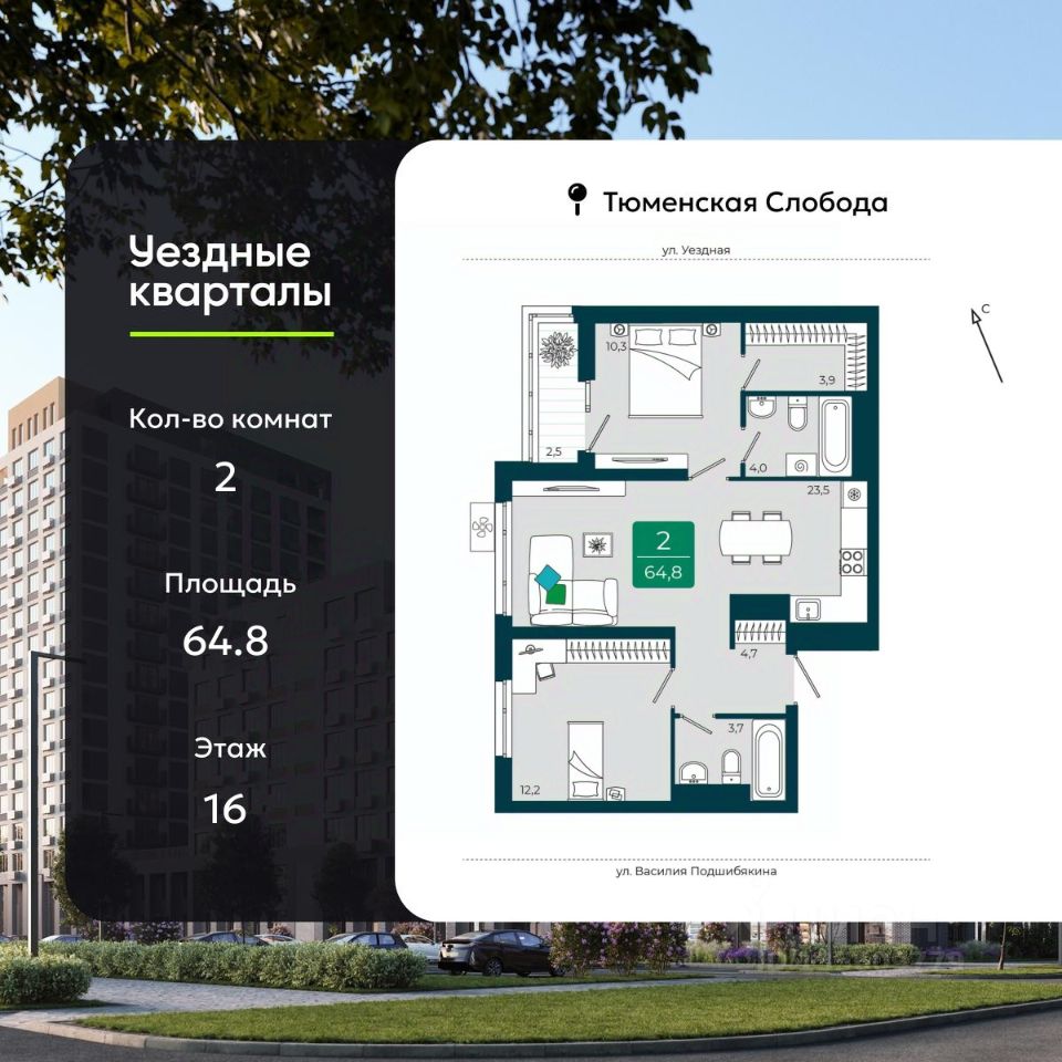 Просторная 2-комн. квартира в ЖК "Уездные кварталы" на 16 этаже. Квартира без отделки, новый собственник может сделать ремонт по индивидуальному проекту. Общая площадь: 64.8 кв.м., жилая: 22.5 кв.м., площадь просторной кухни-столовой: 23.5 кв.м. Комнаты изолированные, все окна выходят на одну сторону. В квартире одна лоджия, два совмещенных санузла. Высота потолков 2.72 м.