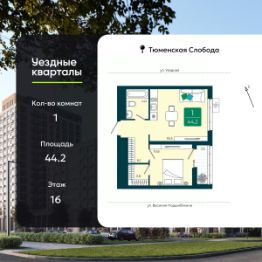1-комн. квартира от застройщика с предчистовой отделкой в ЖК "Уездные кварталы" на 16 этаже. Общая площадь: 44.2 кв.м., жилая: 10.6 кв.м., площадь просторной кухни-столовой: 18.3 кв.м. Все окна выходят на одну сторону. В квартире одна лоджия, один совмещенный санузел. Высота потолков 2.72 м.