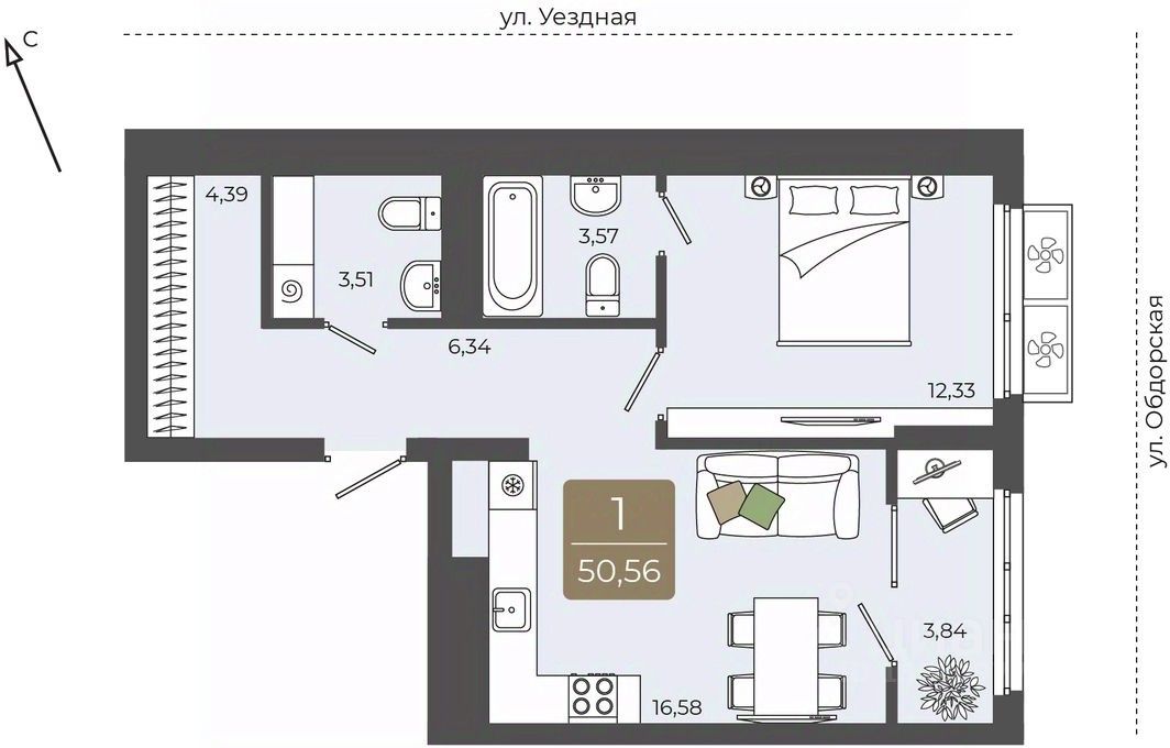 1-комн. квартира в ЖК "Мидгард на Уездной" на 3 этаже. Квартира без отделки, новый собственник может сделать ремонт по своему дизайн-проекту. Общая площадь: 50.56 кв.м., жилая: 12.33 кв.м., площадь просторной кухни-столовой: 16.58 кв.м. Все окна выходят на одну сторону. В квартире одна лоджия, один совмещенный и один раздельный санузел. Высота потолков 2.72 м.