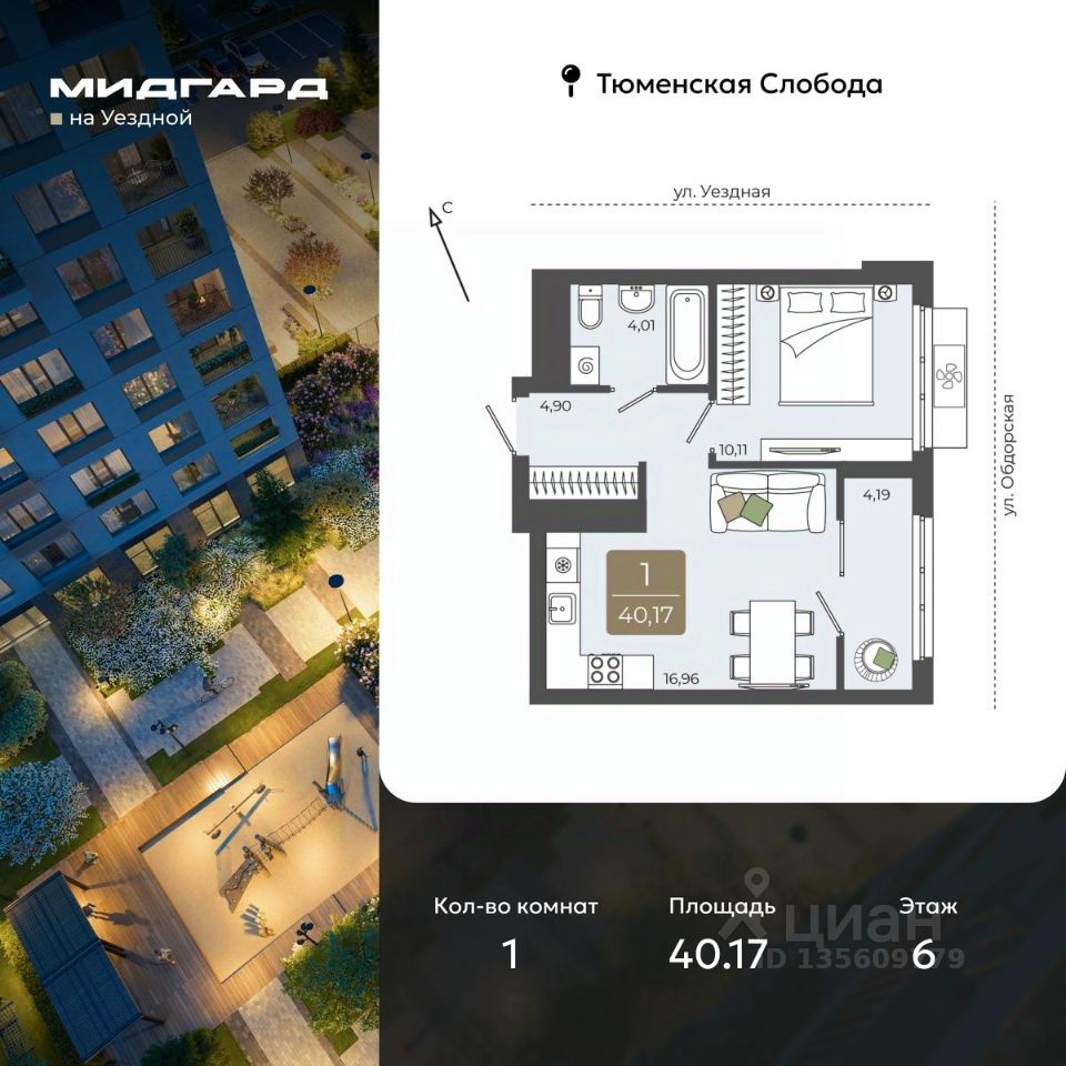 1-комн. квартира в ЖК "Мидгард на Уездной" на 6 этаже. Квартира без отделки, новый собственник может сделать ремонт по своему проекту. Общая площадь: 40.17 кв.м., жилая: 10.11 кв.м., площадь просторной кухни-столовой: 16.96 кв.м. Все окна выходят на одну сторону. В квартире одна лоджия, один совмещенный санузел. Высота потолков 2.72 м.