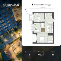Двухкомнатная квартира от застройщика в ЖК "Мидгард на Уездной" на 11 этаже. Квартира без отделки, после выдачи ключей можно делать ремонт. Общая площадь: 62.14 кв.м., жилая: 22.15 кв.м., площадь просторной кухни-столовой: 21.68 кв.м. Комнаты изолированные, все окна выходят на одну сторону. В квартире один балкон и одна лоджия, два совмещенных санузла. Высота потолков 2.72 м.