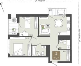 Двухкомнатная квартира от застройщика в ЖК "Мидгард на Уездной" на 12 этаже. Квартира без отделки, после оформления собственности можно делать ремонт. Общая площадь: 67.17 кв.м., жилая: 21.66 кв.м., площадь просторной кухни-столовой: 17.01 кв.м. Угловая квартира, очень светлая, естественная вентиляция при открытии окон. В квартире один балкон и одна лоджия, один совмещенный и один раздельный санузел. Высота потолков 2.72 м.