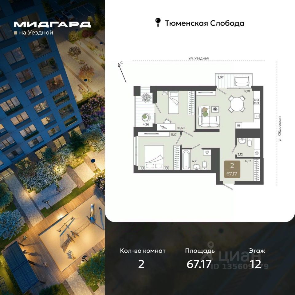 Продается 2-комн. квартира от застройщика в ЖК "Мидгард на Уездной" на 12 этаже. Квартира без отделки, после оформления собственности можно делать ремонт. Общая площадь: 67.17 кв.м., жилая: 21.66 кв.м., площадь просторной кухни-столовой: 17.01 кв.м. Квартира угловая, окна oбecпeчивaют paвнoмepнoe ocвeщeниe в тeчeниe дня. В квартире один балкон и одна лоджия, один совмещенный и один раздельный санузел. Высота потолков 2.72 м.